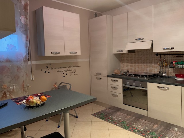 L’ingresso conduce direttamente nell’ampio soggiorno open space, impreziosito dalla presenza del terrazzo privato ideale per momenti di relax o cene all’aperto. La cucina abitabile è moderna e funzionale, dotata di numerosi mobili contenitori e finiture chiare che donano luminosità agli spazi; la pavimentazione in ceramica uniforme collega armoniosamente tutte le zone giorno della casa.