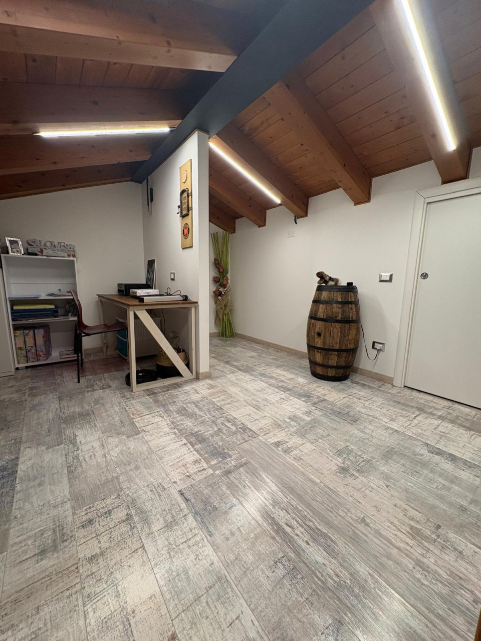 La villa si apre su un luminoso soggiorno con cucina open space, perfetto per momenti conviviali e cene in famiglia. Completano il piano terra un elegante bagno, lavanderia e una camera da letto matrimoniale che offre comfort e tranquillità. Al primo piano troviamo una zona relax versatile, ideale come studio o spazio ricreativo.
